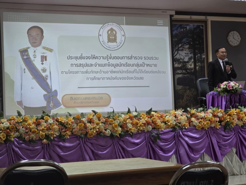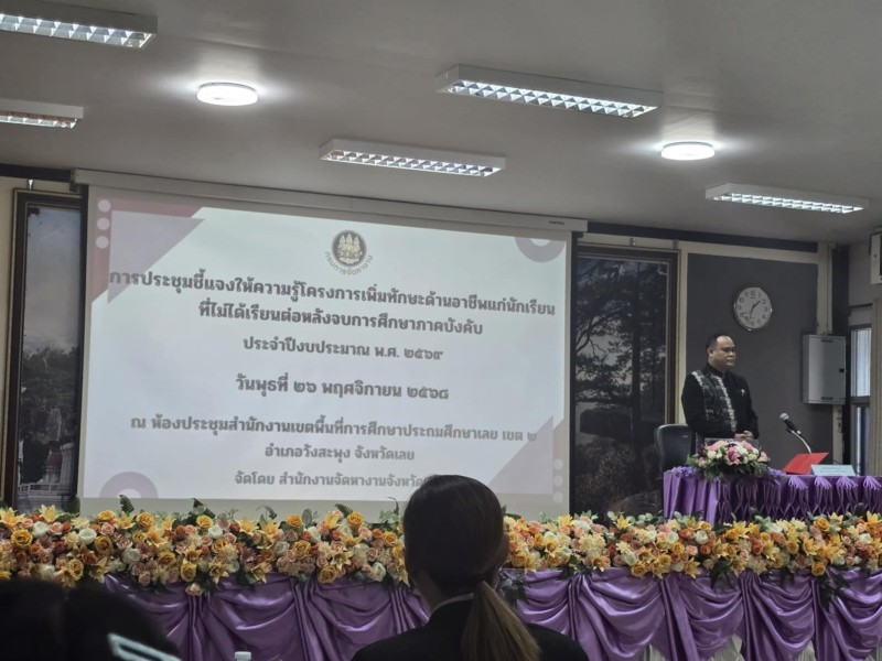วันพุธที่ ๒๖ พฤศจิกายน ๒๕๖๘ นางสาวชัญญภัทร ทองประทับ ผู้อำนวยการสถานศึกษา และนางสาวอมรรัตน์ สุวรรณศรี ครู ได้เข้าร่วมโครงการเพิ่มทักษะด้านอาชีพแก่นักเรียนที่ไม่ได้เรียนต่อหลังจบการศึกษาภาคบังคับของจังหวัดเลย แก่ผู้บริหารโรงเรียนและครูแนะแนวเขตอำเภอวังสะพุง เอราวัณ หนองหิน ผาขาว ภูหลวง และภูกระดึง ร่วมกับสำนักงานจัดหางานจังหวัดเลย โดยมีสิบเอกมงคล ศรนวล ศึกษาธิการจังหวัดเลย เป็นวิทยากรบรรยายให้ความรู้ขั้นตอนการสำรวจ รวบรวม การสรุปและจำแนกข้อมูลนักเรียนกลุ่มเป้าหมาย โดยมีวัตถุประสงค์เพื่อให้นักเรียนได้มีทักษะด้านอาชีพหลังจบการศึกษาภาคบังคับ นำไปสู่การเป็น “แรงงานมีฝีมือ” ณ ห้องประชุมสำนักงานเขตพื้นที่การศึกษาประถมศึกษาเลย เขต ๒