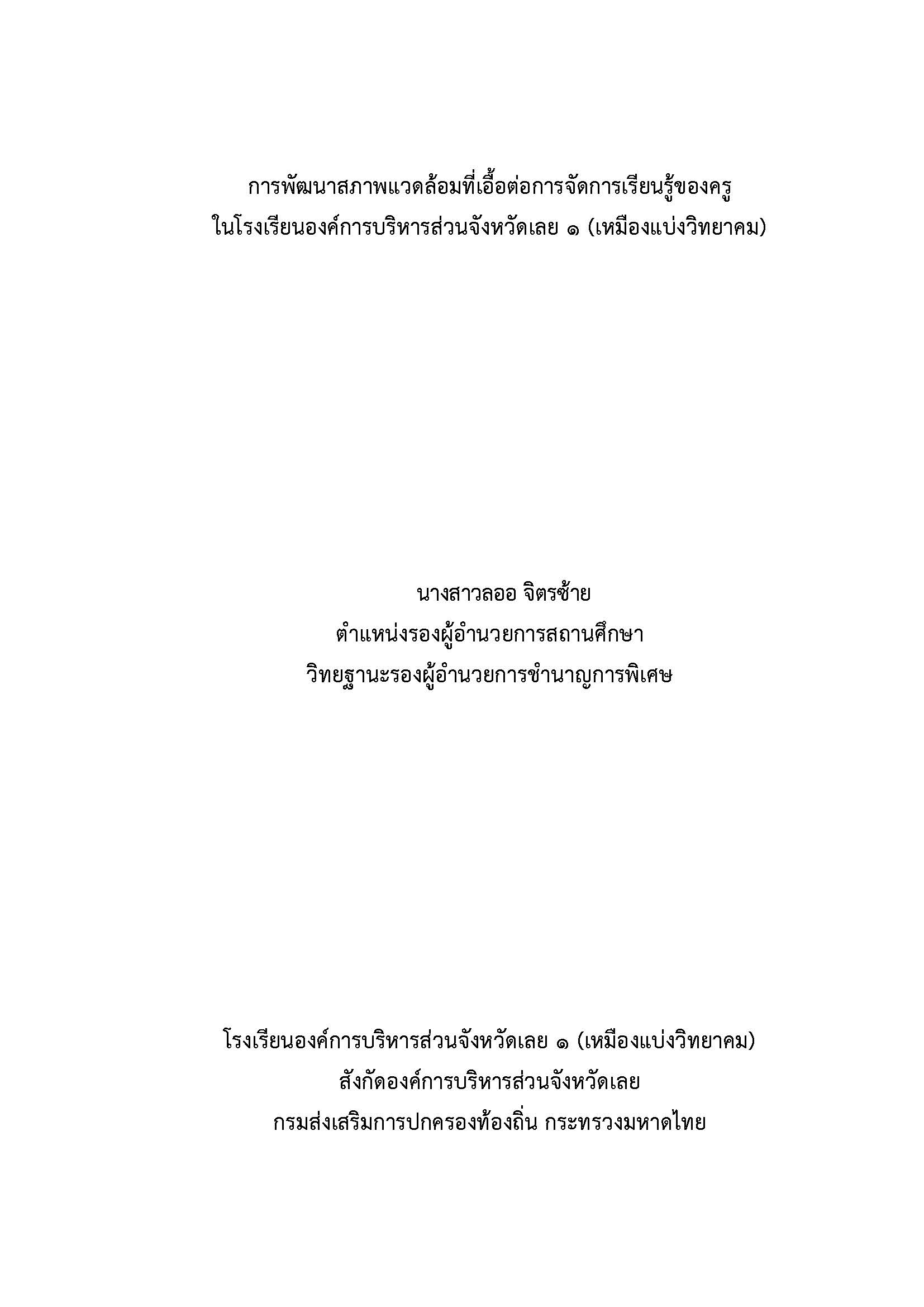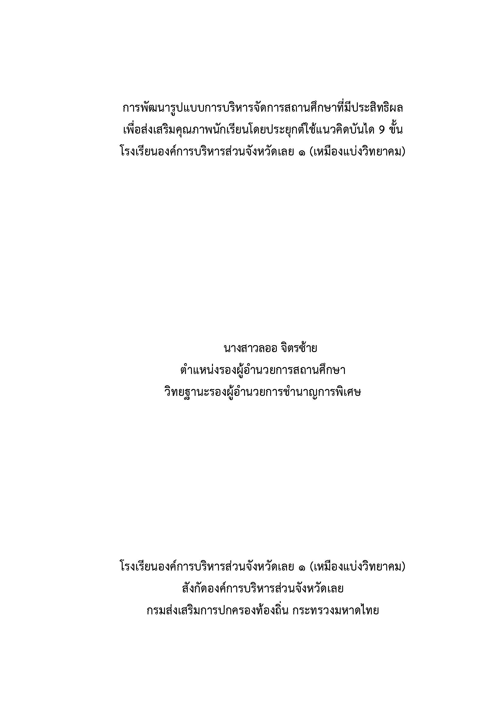 การพัฒนารูปแบบการบริหารจัดการสถานศึกษาที่มีประสิทธิผล เพื่อส่งเสริม คุณภาพนักเรียนโดยประยุกต์ใช้แนวคิดบันได 9 ขั้น โรงเรียนองค์การบริหาร ส่วนจังหวัดเลย ๑ (เหมืองแบ่งวิทยาคม) |